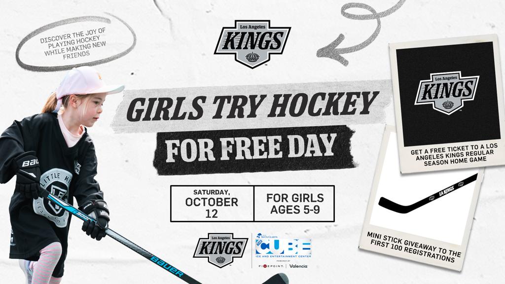 The Cube – Ice and Entertainment Center, Powered by FivePoint Valencia, is excited to host the Girls Try Hockey for Free Day, a special event designed to introduce girls to the thrilling sport of hockey! The free event, in partnership with the Los Angeles Kings, will take place on Saturday, October 12 from 11:00 a.m. to 2:30 p.m., and offers a fun-filled day of activities that are perfect for newcomers to the sport.